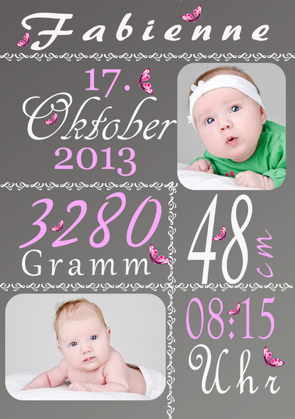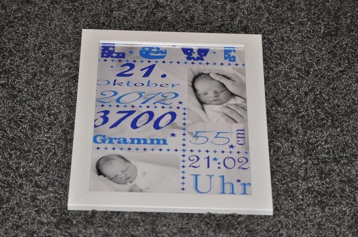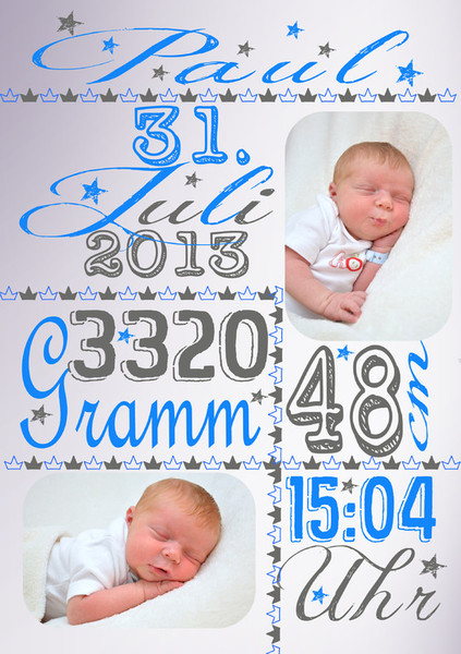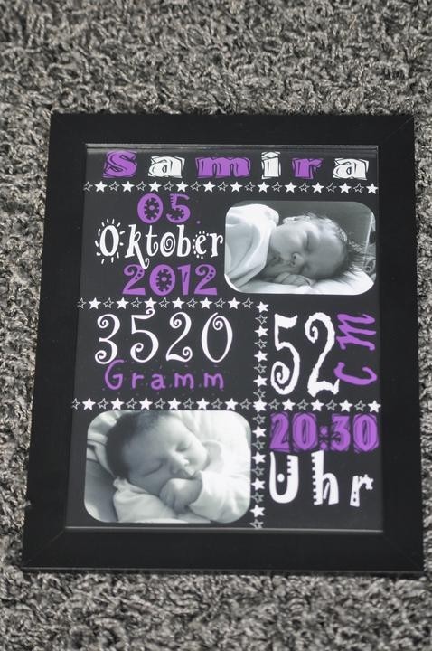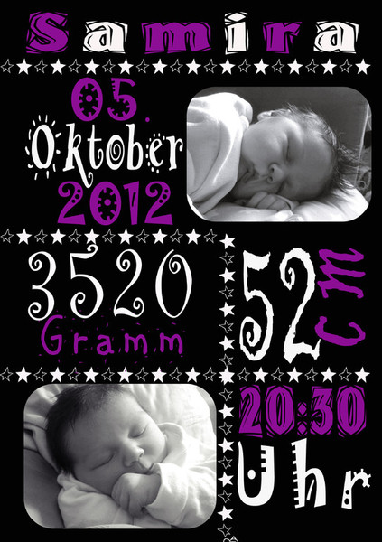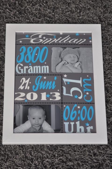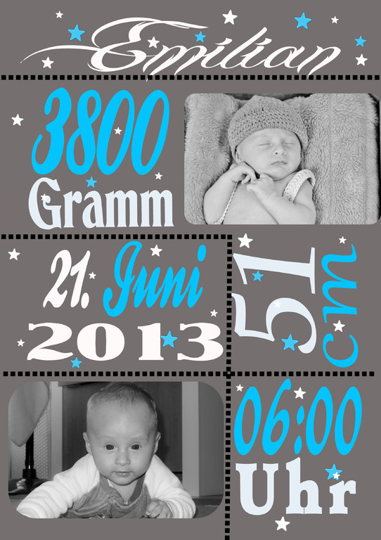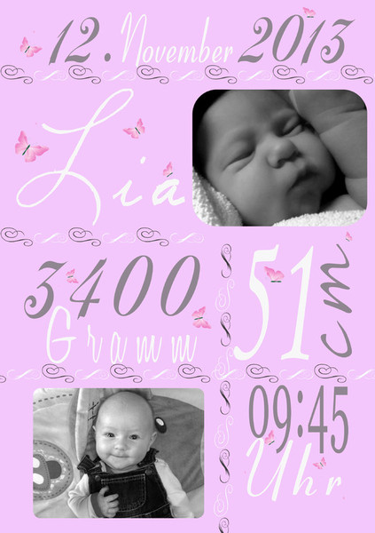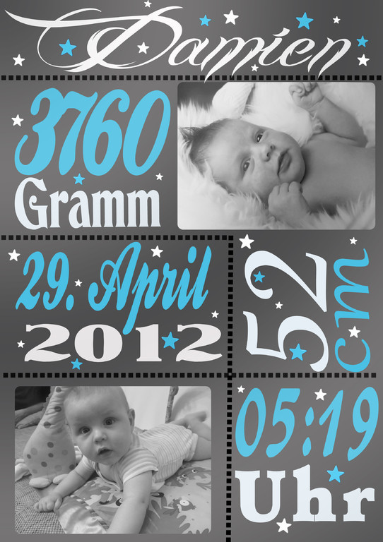 Was ich dazu benötige sind 2- 3 Bilder des kleinen Engels ( die Bilder müssen NICHT von mir gemacht worden sein !!!) ..... sowie die Geburtsdaten ( Name, Datum, Uhrzeit, Gewicht, Größe) Eine Stilwunsch bzgl. der Schriftart sowie Farbvorstellungen und Gestaltungswünsche nehme ich sehr gerne entgegen und versuche ganz Euren Wünschen gerecht zu werden.