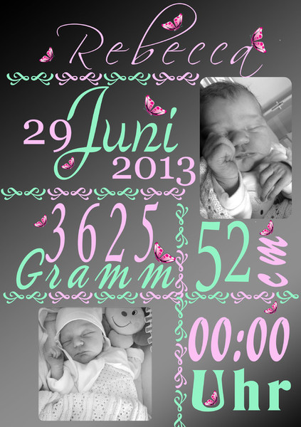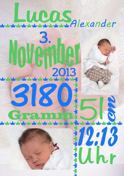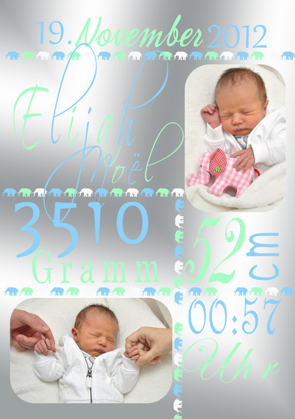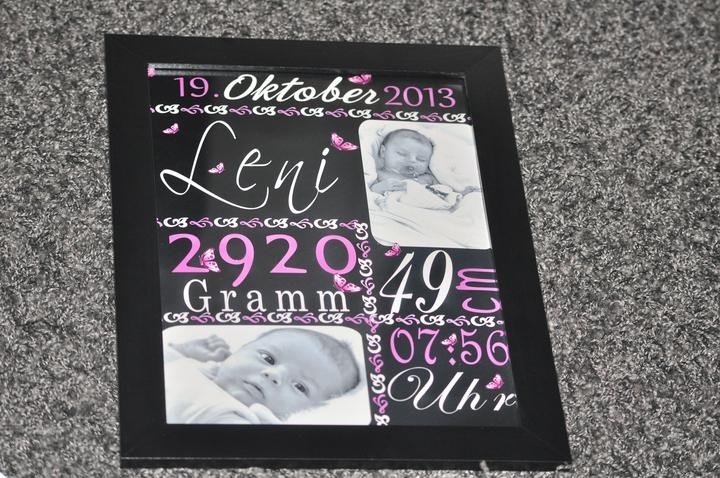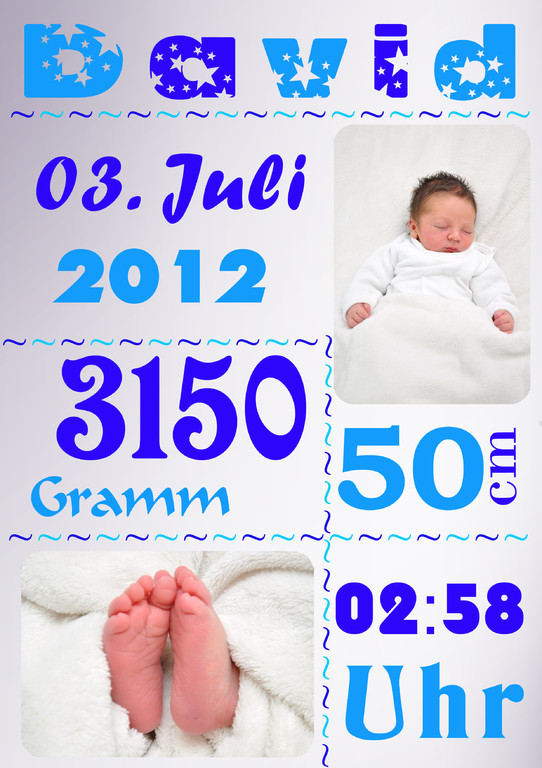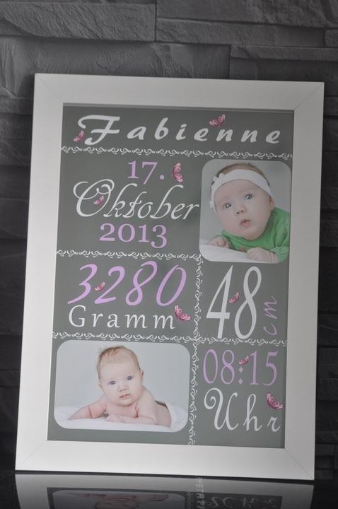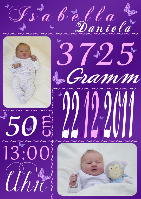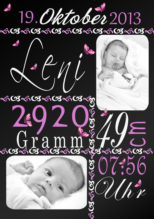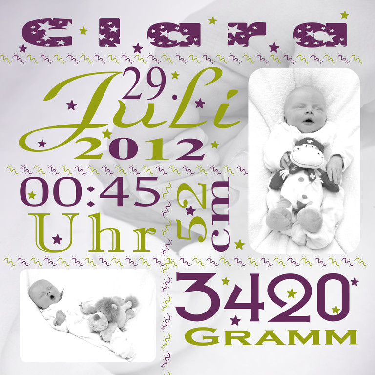 Was ich dazu benötige sind 2- 3 Bilder des kleinen Engels ( die Bilder müssen NICHT von mir gemacht worden sein !!!) ..... sowie die Geburtsdaten ( Name, Datum, Uhrzeit, Gewicht, Größe) Eine Stilwunsch bzgl. der Schriftart sowie Farbvorstellungen und Gestaltungswünsche nehme ich sehr gerne entgegen und versuche ganz Euren Wünschen gerecht zu werden.